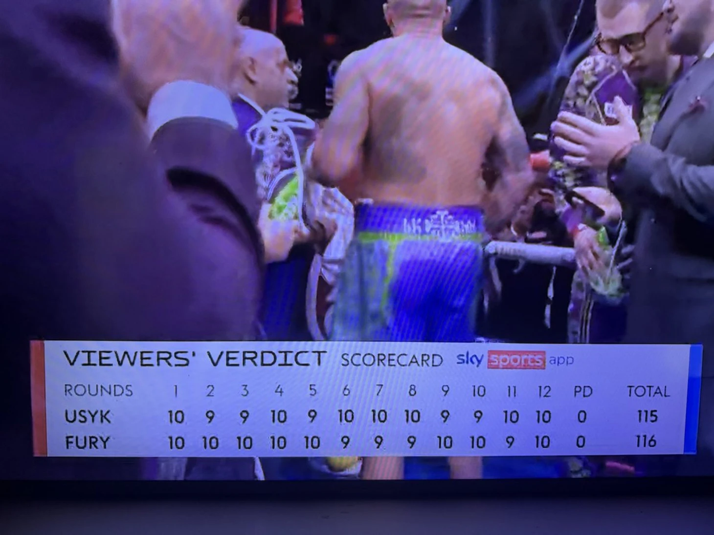 Фьюри победил со счетом 116-115. Усик, по мнению зрителей, выиграл 6-й, 7-й, 8-й и 11-й раунды.