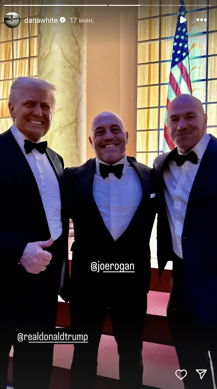 Уайт выложил совместное фото с Трампом и комментатором UFC Джо Роганом.