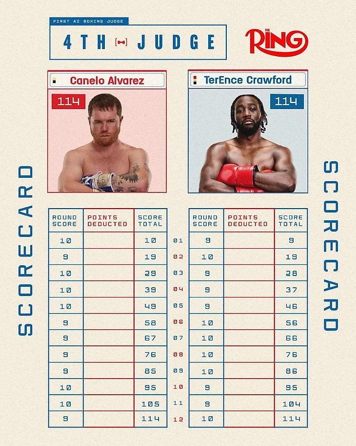 Авторитетный журнал The Ring опубликовал вердикт боя Сауля Альвареса и Теренса Кроуфорда, который вынес искусственный интеллект. Компьютер посчитал ничью 114-114.
