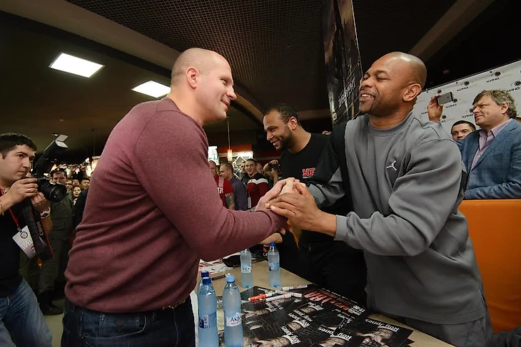 Знаменитый в недавнем прошлом боец ММА Федор Емельяненко и бывший абсолютный чемпион мира по боксу в полутяжелом весе Рой Джонс тепло попроветствовали друг друга во время одного из мероприятий, посвященных предстоящему турниру М-1 Challenge 47, который пройдет 4 апреля в Оренбурге.