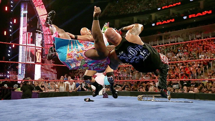 Вчера вечером "Новый день" решили закатить настоящую пирушку в честь их рекордного тайтл-рейна. 337 дней они являются лучшей командой в WWE, и никто в истории не добивался такого результата. После традиционных чантов и восклицаний, троица решила, что пора их коллективу расширяться, и они направились в зрительный зал искать себе нового члена команды. Им стал зритель из зала по имени Саннибой, который ужасно похож на Тёрка из сериала "Клиника". Пока они пытались выпытать из поклонника хоть какую-то важную информацию, на них напали Карл Андерсон и Люк Гэллоуз, в буквальном смысле уничтожив всю магию на ринге. После избиения чемпионов двое крушителей подошли к Саннибою и, предварительно высморкавшись, швырнули футболку "Нового дня" тому в лицо.