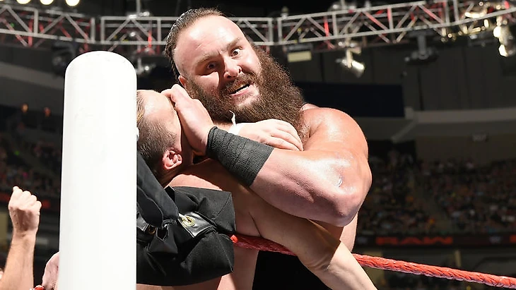 Также изменения после драфта претерпел персонаж Брона Строумана. Ещё на Battleground мы наблюдали его в составе сектантов "Семьи Уайатта", как вчера он вышел под собственную музыкальную тему и с обновлённым имиджем, в котором нашлось место выбритым бокам на голове и двум косам. Эта груда мышц и ненависти без особых проблем убила на ринге хлюпенького местного рестлера, который запомнится разве что татуировкой с логотипом Off Spring на руке.