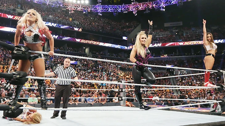 Данный поединок изначально предполагался, как "три на три", но из-за проблем Евы Мари официально стал гандикап-матчем. Первыми к рингу вышли хорошие девчата, где особенно можно было отметить Бекки Линч, получившую огненную поддержку от трибун. Вслед за ними к рингу вышли Алекса и Наталья, после чего зазвучала музыка Евы Мари с соответствующим мужским анонсом, приведя публику в лёгкую истерику. Но чуда не произошло, и вместо отстранённой жрицы огня своё возвращение на ринг совершила Никки Белла, присоединившись к плохим девчонкам, а заодно к ростеру SmackDown. Сам матч получился очень даже неплохим и местами смотрелся вполне себе приятно: девушки аккуратно исполняли приёмы, передавали тэги, а бодрая Никки так и вовсе проводила несвойственные для себя атаки. В концовке именно ей предстояло решить исход матча, и она это сделала проведя отличный TKO, поставив точку в вопросе о своём новом финишере.