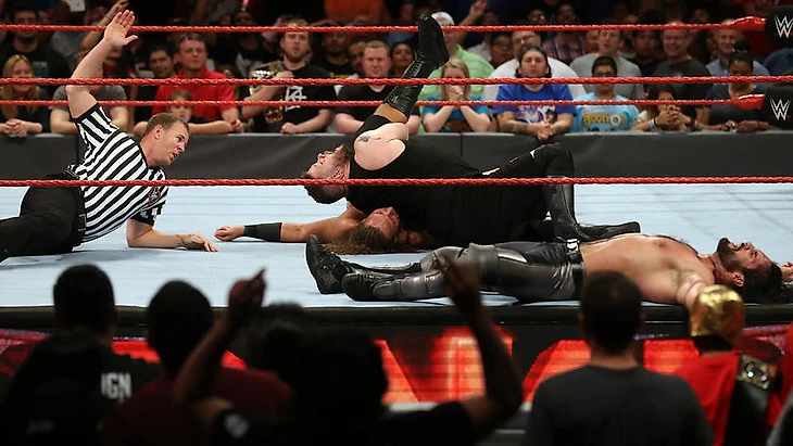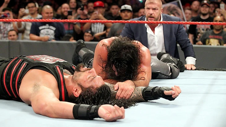 После того как матч превратился в тройник, канадец укатился с ринга, предоставив двум парням из "Щита" разбираться между собой. Разбушевавшийся Роман Рейнс сначала, как следует, прошёл по Роллинсу, затем уже за рингом он от души впаял Оуэнсу и заврешил мощным гарпуном во всё того же Сэта прямо на глазах Стефани и Мика Фоли. Далее к самоанцу подскочил вернувшийся Трипл Эйч и провёл "педигри", после чего поочерёдно закатил тела Рейнса и Роллинса, благодаря чему Сэту удалось выбить из матча своего бывшего соратника.