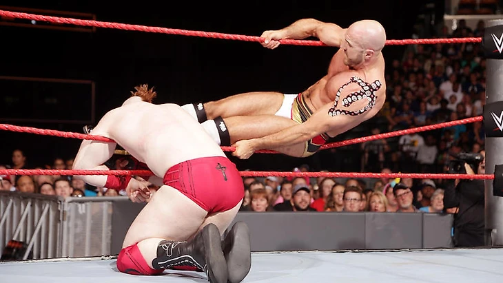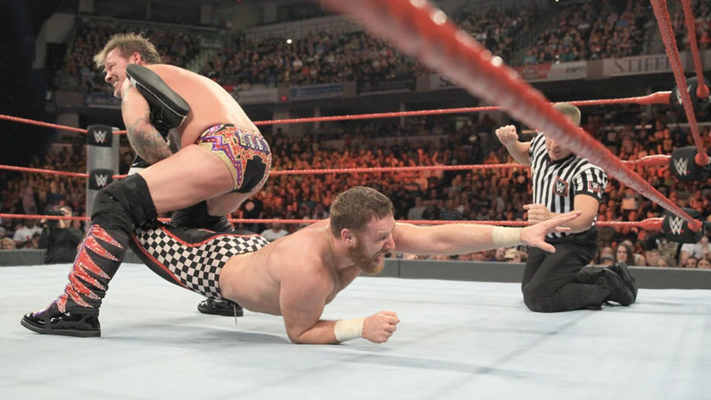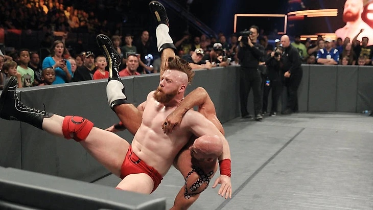 Далее нас ожидал канадский междусобойчик с незримой тенью Кевина Оуэнса над рингом. Ведь внутри четырёх углов встречались бывший и нынешний лучшие друзья Чемпиона Вселенной WWE. После их перебранки на ток-шоу Криса Джерико стало ясно, что схватка переходит в личное пространство, что лишь добавило ей драматизма. На протяжении всего матча инициатива находилась где-то посередине и подкреплялась немыслимым количеством "чопов" с обеих сторон. Темп заметно отличался от первых поединков вечера и было видно, что Зейну тяжеловато тащит на себе весь матч. Но качество никуда не девалось, и мы наблюдали хороший поединок, в котором главную роль сыграли реверсы: Крису удалось трижды избежать встречи с "хелува киком", в то время как Сэми удачно обходил убойные "коудбрейкеры". Но продолжаться до бесконечности так не могло, и в концовке Зейн был близок к победе, но ветерану хватило всего одного "коудбрейкера" из ниоткуда, чтобы склонить чашу весов в свою пользу, одержав серьёзную победу.