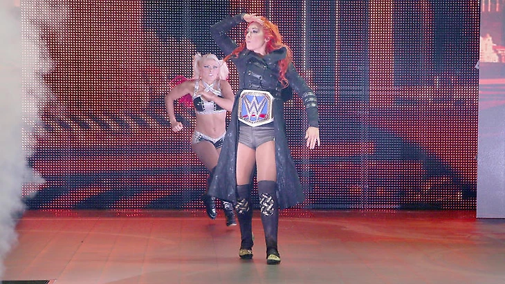 Следующей к рингу вышла Бекки Линч. Ну как вышла, почти сразу же, как чемпионка SmackDown появилась на рампе, на неё сзади напала Алекса Блисс и принялась избивать ирландку. "Харли Куинн" не постеснялась стащить пояс с обезвреженной конкурентки и попозировать с ним.