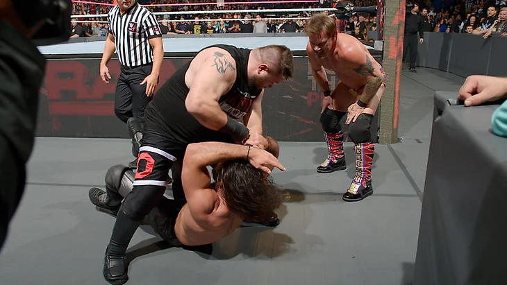 Естественно, такая дерзость не могла пройти незаметно, и уже через минуту Роллинс вновь был избит сразу двумя парами рук и ног, после чего друзья решили покинуть зал. Но если Крис Джерико успел уйти за кулисы, то Чемпиона Вселенной Сэту удалось догнать и вновь развязать драку. Подоспевшие секьюрити безрезультатно пытались растащить враждующие стороны, после чего Кевин поставил финальную точку, проведя любимую "бомбу" об апрон ринга, на чём шоу и вышло из эфира.