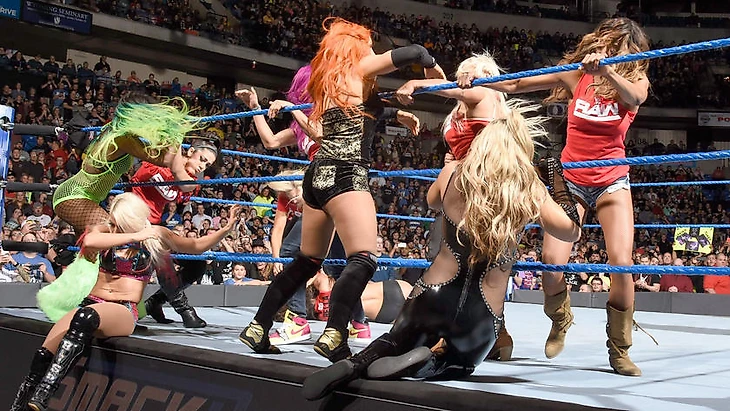 Как и ружьё в цитате Чехова, рано или поздно девушки должны были добраться до Шарлотты, которая решила поиздеваться над Никки. Близняшка моментально забыла про бой, и через мгновение капитаны брендовых команд уже сражались в середине ринга. Шарлотте на помощь выскочили остальные участницы, курицы "синего" бренда также подскочили и началось ром, плеть и содомия... массовое побоище, в результате которого рестлерши SmackDown отстояли ринг.