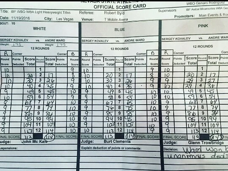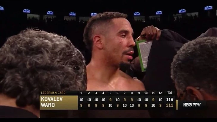 В целом мы получили доминирование Ковалёва в первой половине боя, и очень конкурентный бой во второй половине боя. В принципе, сомнений, что победил Ковалев, нет, но судьи решили иначе, отдав победу Уорду единогласным решением 114-113. Думаю будет реванш и он уже расставит всё по своим местам, а пока остаётся только поздравить нового чемпиона с победой, пусть и не заслуженной. Как говорится, победителей не судят.