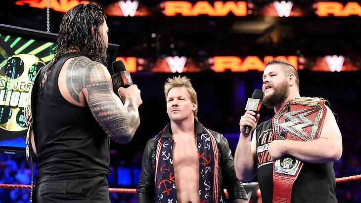 Вслед за фразой "Мне не нужен Крис" прозвучало ещё более уничижительное "заткнись", когда Кевин прервал бесконечный разгон Джерико по внесению Романа в знаменитый Список. Самоанец ловко подловил чемпиона и предложил провести нетитульный поединок на сегодняшнем шоу. И если Роман в нём побеждает, то получает свой тайтл-шот на PPV Road block. Разъярённый Кевин принял условия, а друзья отправились ругаться за кулисы. Там они окончательно перессорились, и Крис направился на выход с арены, где его подловил Сэт Роллинс и буквально протащил по всей автостоянке, завершив сегмент отличным "педигри" на крыше припаркованного седана.