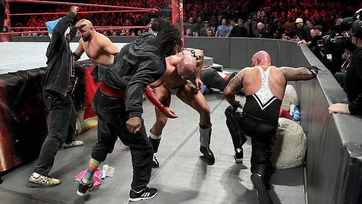 Зрителям на арене также пришлась по вкусу настоящая мужская борьба, и они активно поддерживали обе команды. Вскоре действие переместилось за ринг, где "Новый день" решили сыграть на опережение и без особых сожалений начали избивать всех, кто попадался под руку. Без всяких вербальных согласовок Гэллоуз, Сезаро, Андерсон и Шеймус дали достойный отпор командным чемпионам, и на следующем RAW нас ждёт матч тройной угрозы за таг тим титулы.