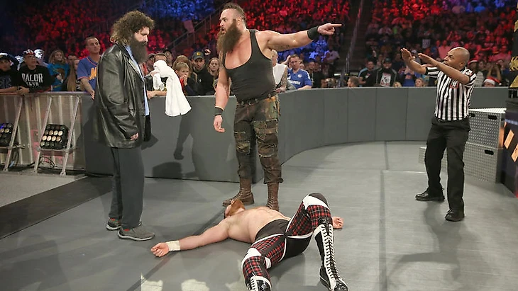 В следующем поединке сошлись "Давид и Голиаф" красного бренда, чтобы проверить моральные качества и стойкость Сэми Зейна. Собственно, за канадцем и осталось бодрое начало поединка, в котором он "дропкиками" раскидывал массивного Строумэна. Как и положено, всё это безобразие продолжалось ровно до первого попадания Брона в рыжую голову, после чего мы вновь лицезрели фирменное избиение младенца. Когда на таймере оставалось меньше четырёх минут, к рингу вышел Мик Фоли с белым полотенцем в руке со страхом потерять ценного работника своего бренда.