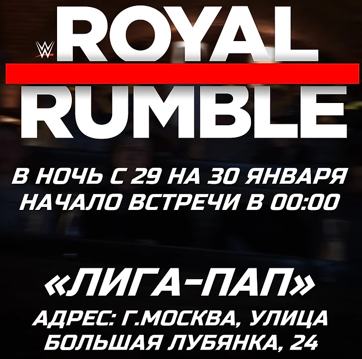 Ребят, начиная с этого года мы хотим сделать традиционными живые сходки на шоу "Большой четвёрки" от WWE. Если у Вас есть желание и возможности, то обязательно записывайтесь и приходите в бар. Если же Вы живёте далеко от Москвы, то приглашаем всех на душевный и ламповый стрим Royal Rumble 2017. Любите рестлинг, как искусство и как спорт. До новых встреч.