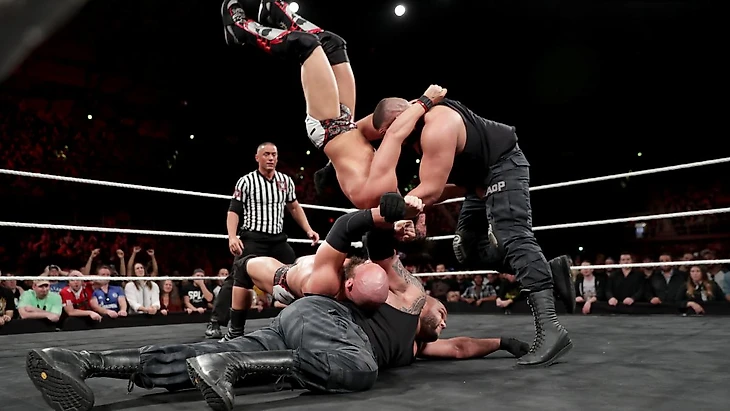 1/3 матча прошла по стандартному для командников сценарию, когда хиллы избивают одного фейса и не дают тому передать таг, но когда Гаргано всётаки смог передать право боя Чампе, тот на столько завёлся, что раскидал авторов и даже провёл им по немецкому суплексу, а потом DIY сделали одному из авторов двойной спир из-за канатов.