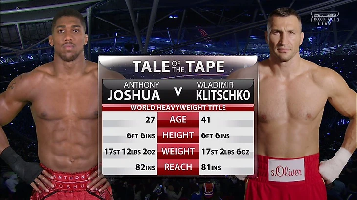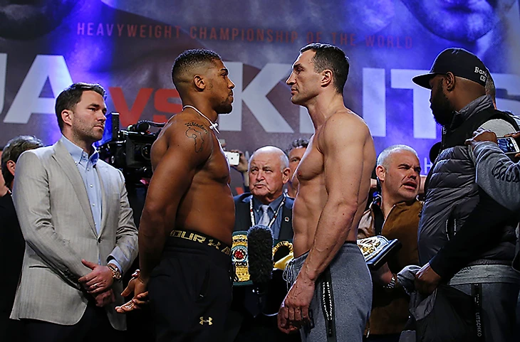 22.30. Накануне боксеры прошли официальную процедуру взвешивания, на которой Джошуа показал рекордный вес в карьере, перевесив Кличко на 4 кг: 113,4 кг против 109,1 кг.