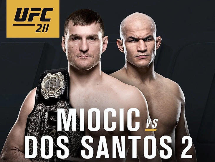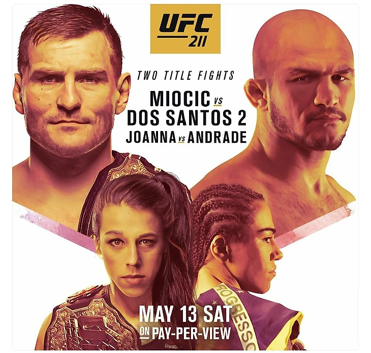 Главным событием турнира UFC 211 в Далласе стал бой между чемпионом UFC в тяжелом весе Стипе Миочичем и бывшим чемпионом Джуниором Дос Сантосом. Так же состоялся бой за титул в женской минимальной весовой категории Йоанна Енджейчик – Джессика Андраде.