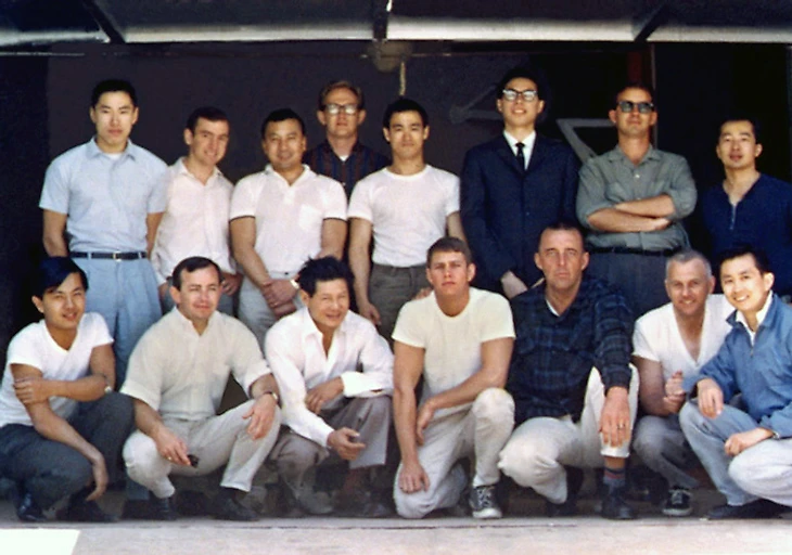 Брюс Ли (задний ряд в центре) со своими учениками в гараже Джеймса Ли (задний ряд третий слева) в 1965 году. Во время, проведенное Брюсом в Окленде, были заложены основы его боевого искусства, хотя этот период остается довольно темным в его изученной вдоль и поперек биографии