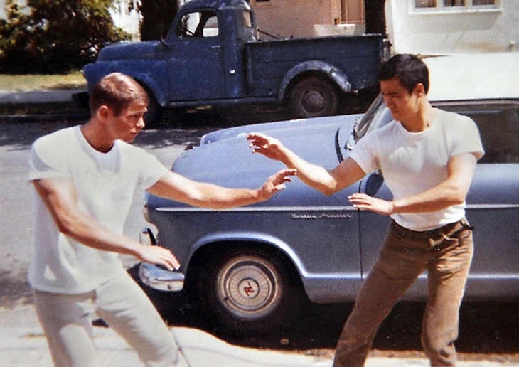 Молодой Брюс Ли с Эдом Паркером и Джеймсом Ли (не родственник) в школе кэмпо-каратэ в ноябре 1963 года. Вскоре Брюс переедет из Сиэтла в Окленд, чтобы продолжить тренировки с группой единомышленников и энтузиастов боевых искусств.