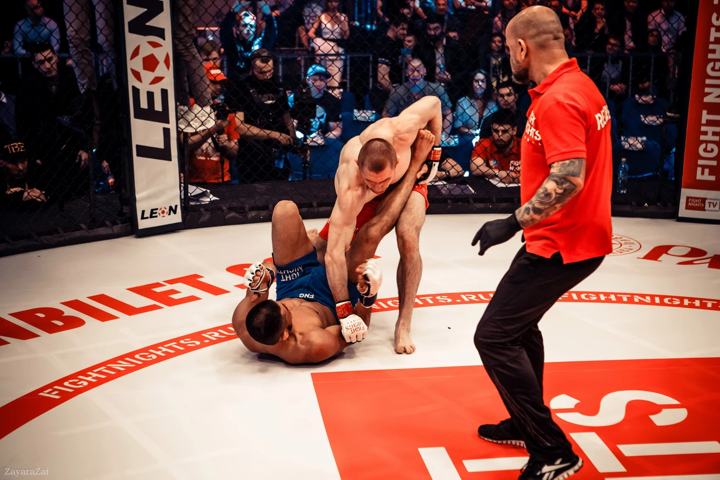 Боец клуба “Ратиборец” Даниил Эрлих выступал первым из пяти екатеринбуржцев и задал планку одноклубникам. После нескольких пропущенных ударов, Даниил перевел бой в родную для себя среду обитания, то есть в партер, и провел удушающий.