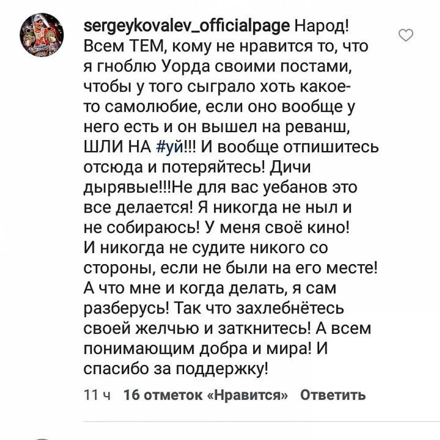 Стоит отметить, что это далеко не первый раз, когда Ковалев откровенно общался с подписчиками своего инстаграма. В декабре прошлого года экс-чемпион предложил «идти на #уй» комментаторам, которые упрекали его за «некорректные» посты в адрес Андрэ Уорда.