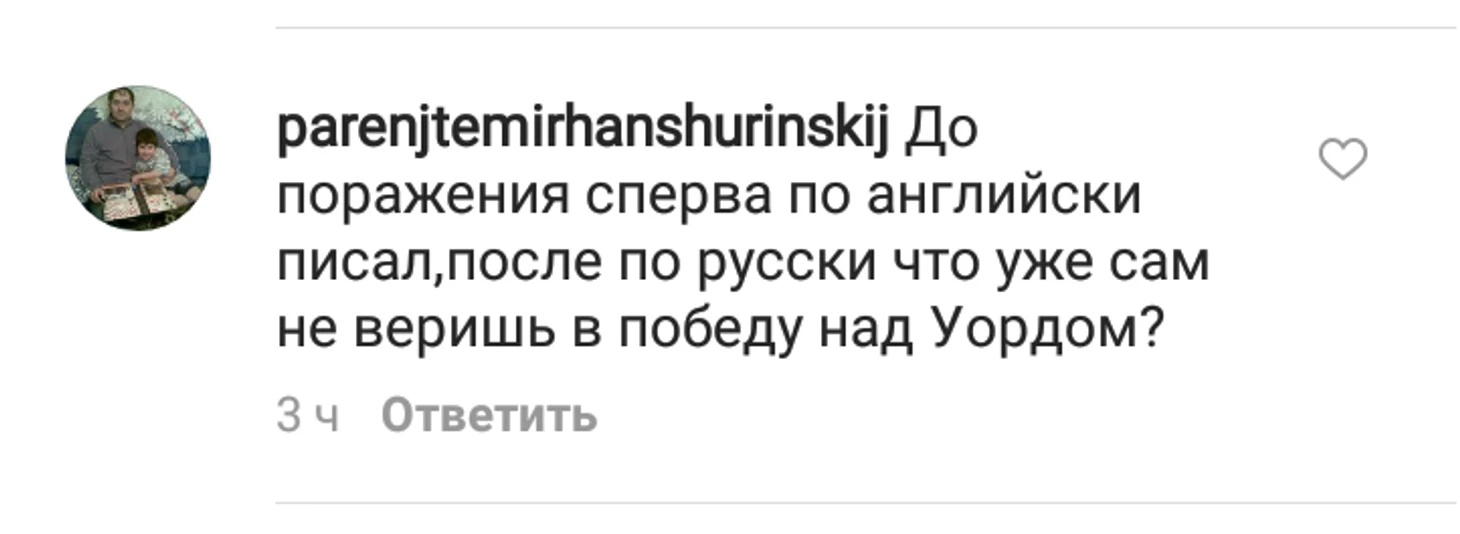 «До поражения сперва по английски писал, после по русски что уже сам не веришь в победу над Уордом?», – написал пользователь под ником Parenj Temirhanshurinskij.