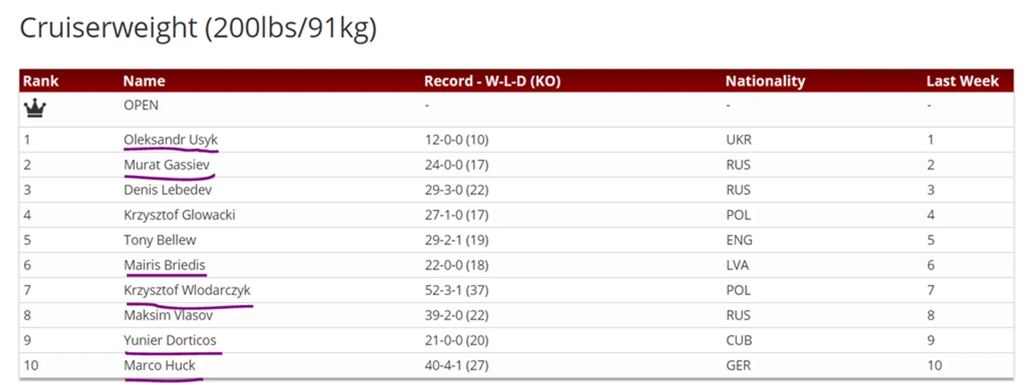 Пока еще не все участники утверждены. Тем не менее, ясно: у крузеров (бойцы в весе до 90,8 кг) будет самый крутой замес в истории этой категории. Итак: