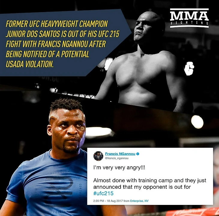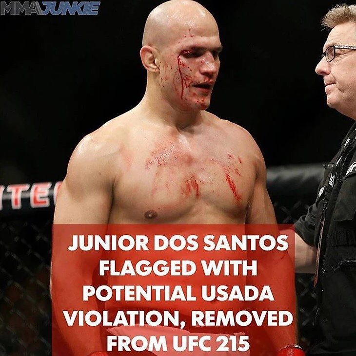 Срочное включение. Я сам немного шокирован после того, как с утра прошёлся по новостной ленте СМИ посвященных смешанным единоборствам. Бывший чемпион UFC в тяжелом весе - Джуниор "Цыгано" Дос Сантос провалил допинг-тест и снят с боя против Фрэнсиса Нганну на UFC:215.