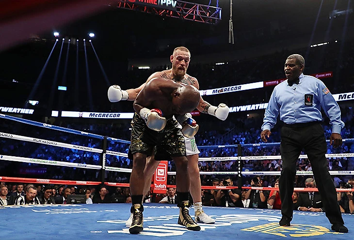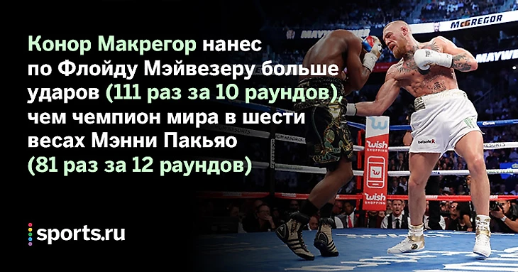 При этом ударная техника Конора выглядела неплохо – он несколько раз ловил Мэйвезера на свой любимый прием – апперкот слева и попадал прямыми ударами. Что удивительно и даже немного забавно – Конору удалось нанести по Флойду больше ударов (111), чем чемпиону мира по боксу в шести весах Мэнни Пакьяо, который два года назад попал по Мэйвезеру 81 раз за 12 раундов.