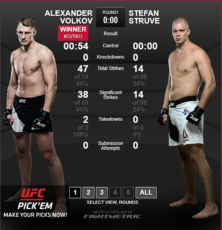 По итогу боя мы вновь должны упомянуть, что Александр обладает высоким бойцовским IQ. Данный бой не был простым, но россиянин уверенно разбивал оппонента на протяжении всех раундов и смог добиться первой досрочной победы в UFC. Бой с Роем Нельсоном также показал насколько дисциплинирован Волков. Своим соперникам он практически не дает попадать по себе, в чем Вы можете убедиться, взглянув на статистику. Единственный серьезный пропущенным ударом был тот самый удар коленом. Очевидно, Волкову это особых проблем не добавило, но об этом стоит помнить, так как все, кто выше его в рейтинге, способны завершить бой одним точным попаданием. Судя по тому, что Волков не обладает убийственной мощью в руках, ему стоит еще более усердно работать над своей защитой и футворком, а также расширять арсенал ударов.
