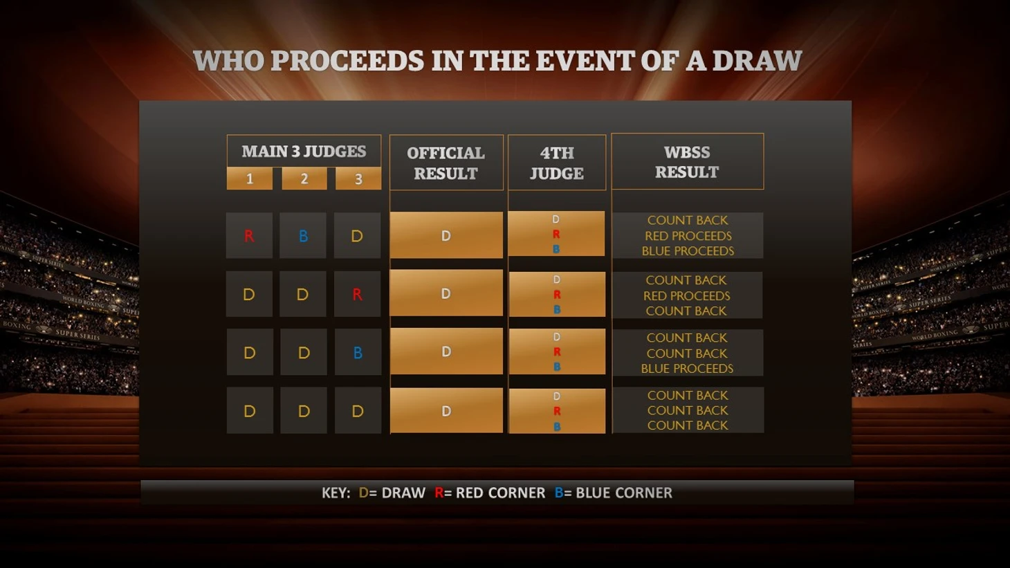 Если, несмотря на карточки четвертого судьи, поединок все равно оценен как ничейный, будет применен метод так называемого обратного отсчета (Count Back). В нем будут оцениваться карточки трех официальных судей. Для начала, будут приниматься во внимание очки за 12-й или последний раунд. Боксер, который по оценкам судей был лучше в этом раунде, то есть как минимум на двух карточках, будет считаться победителем.