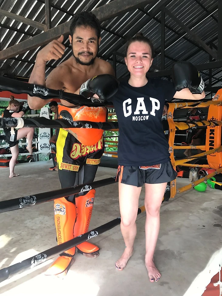 В основном я пишу аналитические статьи, в которых рассказываю о турнирах и бойцах, но на этот раз решила изменить правила и писать от первого лица, чтобы каждый читающий смог проникнуться атмосферой нашего двухнедельного трипа.Перед тем как начать, хотелось бы отметить, что я не являюсь профессиональным спортсменом. Занимаюсь кикбоксингом для себя два раза в неделю в СК «Профи-спорт», иногда добавляя к нагрузке бег.Как вы знаете, Таиланд - это Родина тайского бокса, а также крупнейшая в мире база летних спортивных лагерей. Кэмпы рассредоточены по всей территории страны, включая островную зону.Выбирать в какой кэмп поехать, пришлось долго. Честно скажу, что просмотрели все выпуски «Страны боксеров» Сергея Бадюка, чтобы хотя бы иметь представление о том, какие тренировочные лагеря существуют. В конечном счете, все свелось к тому, что нам был нужен кэмп рядом с морем в пешей доступности. Как и каждому туристу, помимо тренировок нам хотелось отдохнуть на пляже и услышать запах волн.Я уверена, знатоки тайского бокса наслышаны о легендарном клубе SitsongPeenong Бангкок. Именно он воспитал действующих и бывших чемпионов – Люмпини, Рачадамнен, Омнои, WBC, WMC, Kunlun, Glory. Как оказалось, в столице находится не единственный кэмп, второй – на острове Пхукет, рядом с морем, куда мы и отправились.На Сурине SitsongPeenong с 2013 года, достаточно молодой, но быстро прогрессирующий и уже имеющий небольшую базу бойцов. Только за время нашего пребывания трое из ребят выступали на крупном профессиональном турнире Max Muay Thai. (Три победы нокаутами). Менеджер клуба – Тим Фишер, бывший менеджер Фаиртекс.Чтобы попасть в SitsongPeenong Muaythai Training Phuket, нужно заранее (лучше за месяц) оставить заявку на сайте с указанием информации о себе, откуда вы, времени пребывании, и даже о вашем желании взять в аренду мотобайк. Это нужно для того, чтобы администраторы понимали, сколько людей будет тренироваться и проживать в лагере одновременно. Вместить он может двадцать человек, но если вы снимаете номер в гостинице неподалеку, то без труда сможете тренироваться в кэмпе, даже если группа уже состоит из максимального количества спортсменов. Просто предупредите о вашем желании руководство кэмпа.Тренировки и проживание в SitsongPeenong в сутки стоит 1250 бат, в отеле можно найти вариант подешевле, стоимость 1 дня тренировок – 500 бат, частные уроки – 1000 бат за 1 час. Экипировку можно купить на месте: в магазине зала продается практически все необходимое, кроме шлемов. Тайцы не надевают шлемы в спарринги, поэтому и спроса на данный продукт не имеется. Стоимость всего можно посмотреть на сайте кэмпа.
