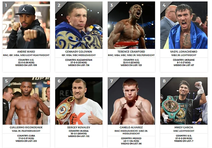 1.00. Но не только чемпионскими поясами ценен этот бой. Победа Канело приблизит его к тройке P4P, а, возможно, и позволит занять в ней место. А GGG в случае успеха будет претендовать на первое место в самом престижном боксерском рейтинге. Сейчас он выглядит вот так (версия The Ring):