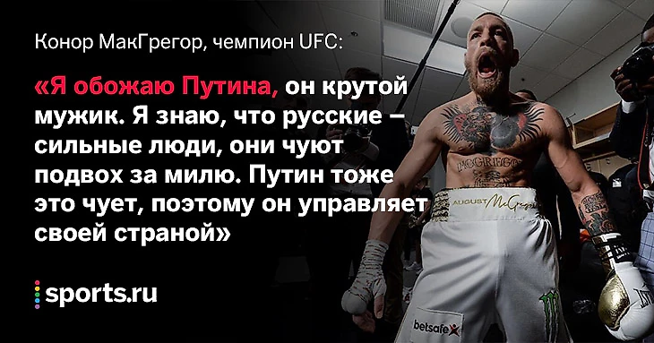 Использовано фото: instagram.com/thenotoriousmma; Gettyimages.ru/Alberto E. Rodriguez; twitter.com/jeffmonson; РИА Новости/Владимир Астапкович, Алексей Никольский, Алексей Дружинин; globallookpress.com/Alexei Druzhinin/Pool; REUTERS/Maxim Zmeyev; kinopoisk.ru