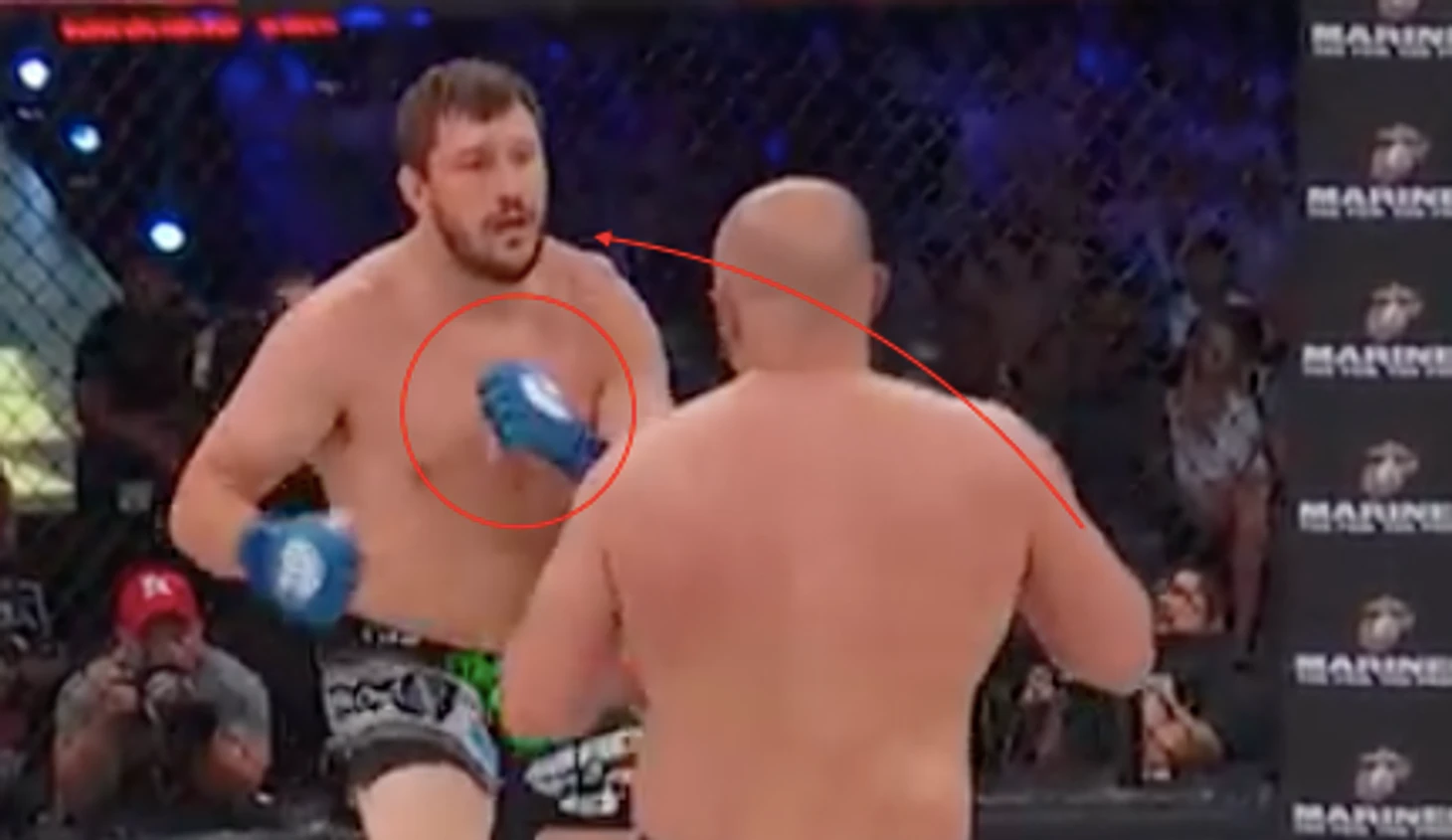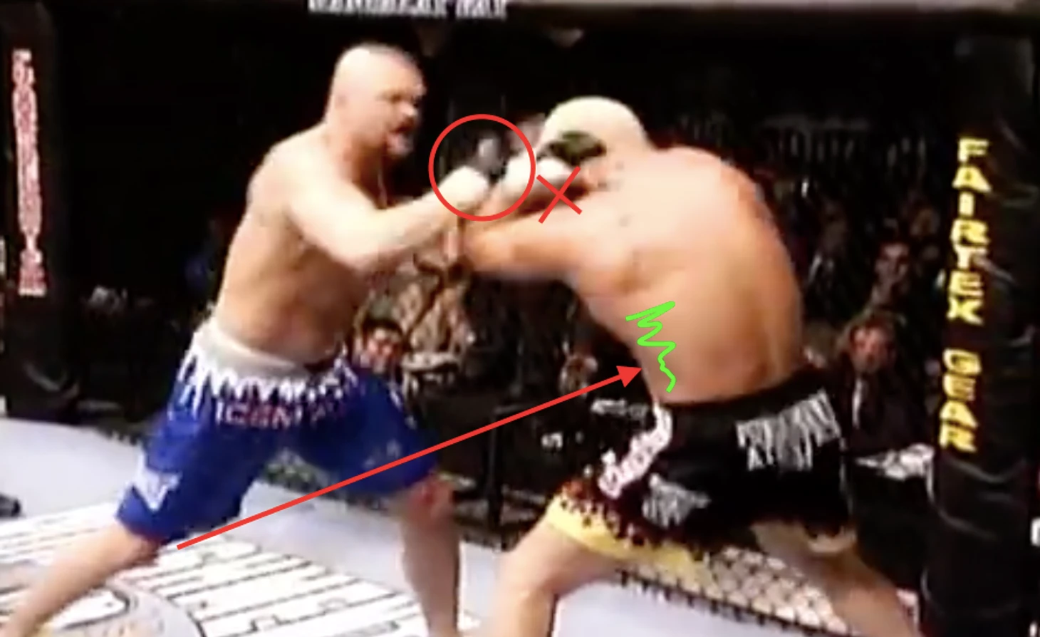 Федор промахнулся оверхэндом в бою против Антонио Родриго Ногейры. В таком положении он максимально беззащитен и не может вовремя ответить ударом.