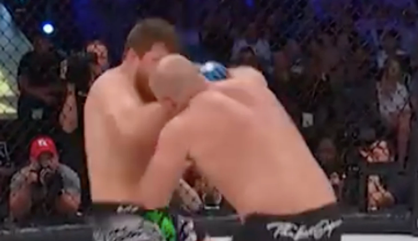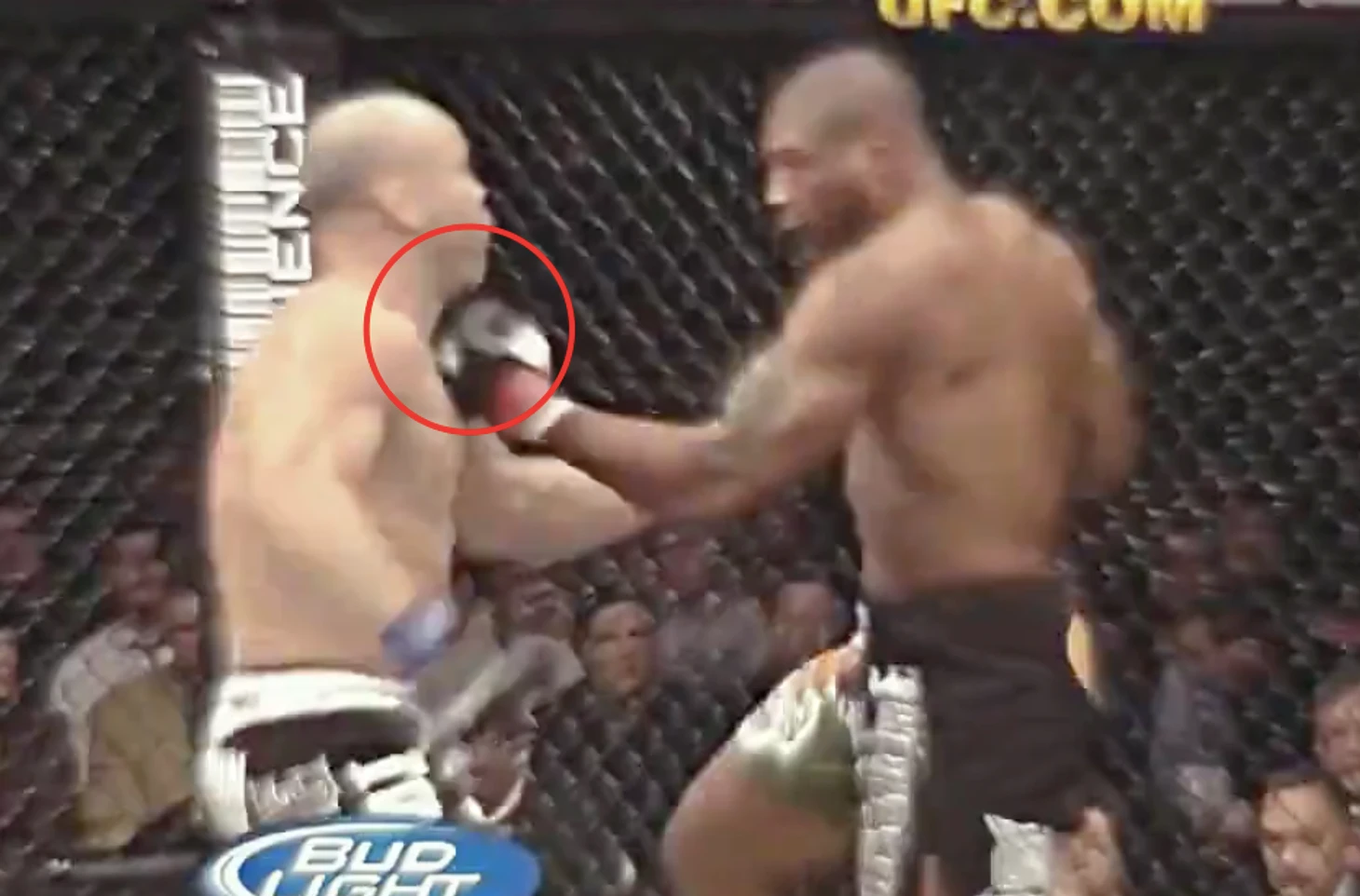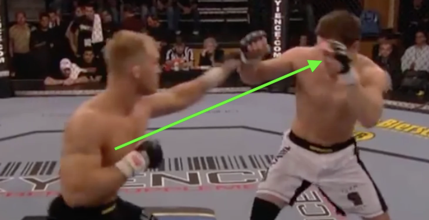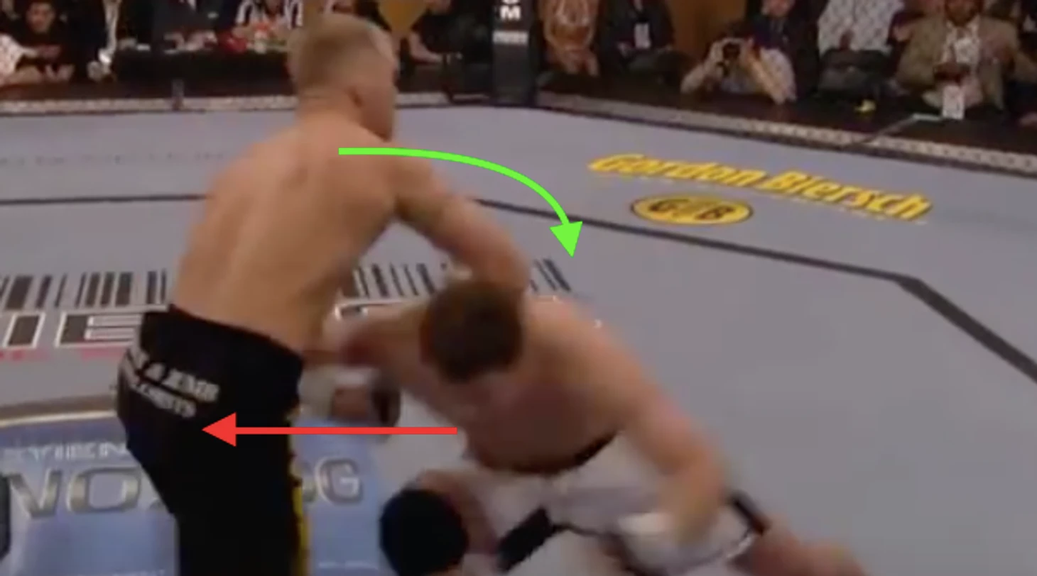 Здесь уже классический оверхэнд. Чейл Соннен видит, как соперник заряжает правую руку…...и ныряет под удар, чтобы соперник промахнулся и лишился равновесия.