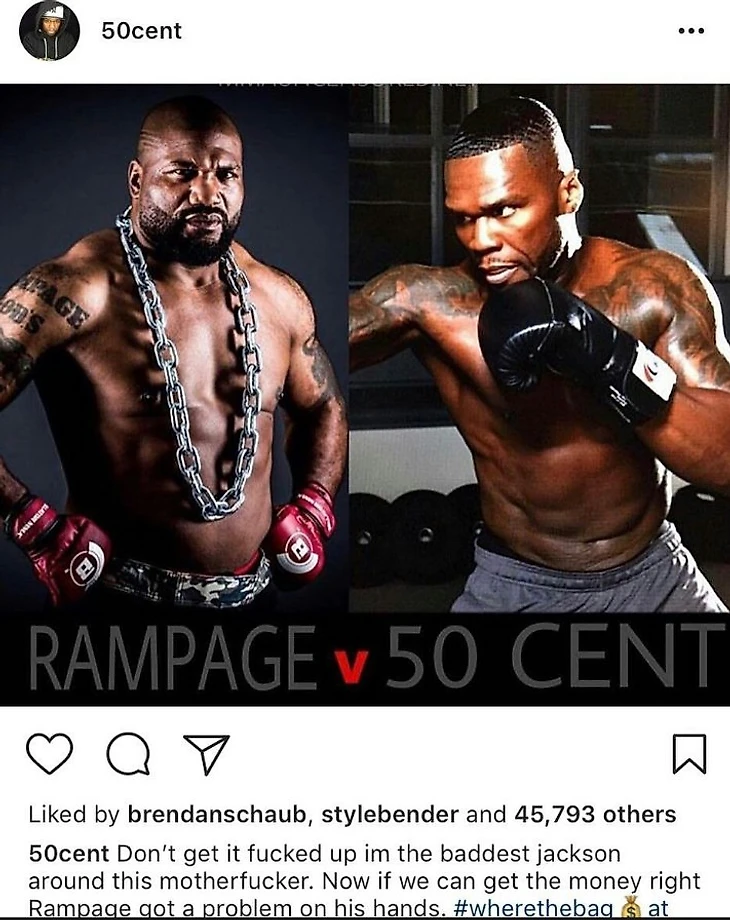Еще через пару дней 50 Cent выложил в инстаграм пост, в котором заявил, что он – самый крутой Джексон в округе. «Если мне заплатят сколько надо, у Рэмпейджа будут проблемы», – написал Кертис. Пост успел набрать 50 тысяч лайков, но потом 50 cent его удалил.