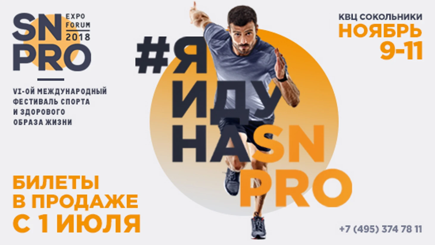 Напомним, что VI Международный фестиваль спорта и здорового образа жизни SN PRO EXPO FORUM 2018 пройдет в Москве на территории КВЦ «Сокольники» сразу в 5ти павильонах и продлится 3 дня с 9 по 11 ноября.