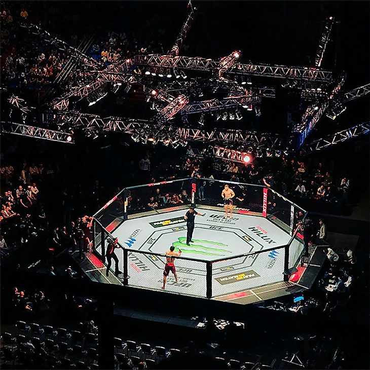 Я пару раз был на российском промоушене Файт Найт и надо сказать, что UFC оооочень похоже. Скорее всего, конечно, ФН взяли под копирку многие вещи (мониторы, проморолики, звуки) и в целом выглядит все круто, но думал, что у американцев как-то поярче будет и побольше. В этом плане, конечно, разницы не заметил.