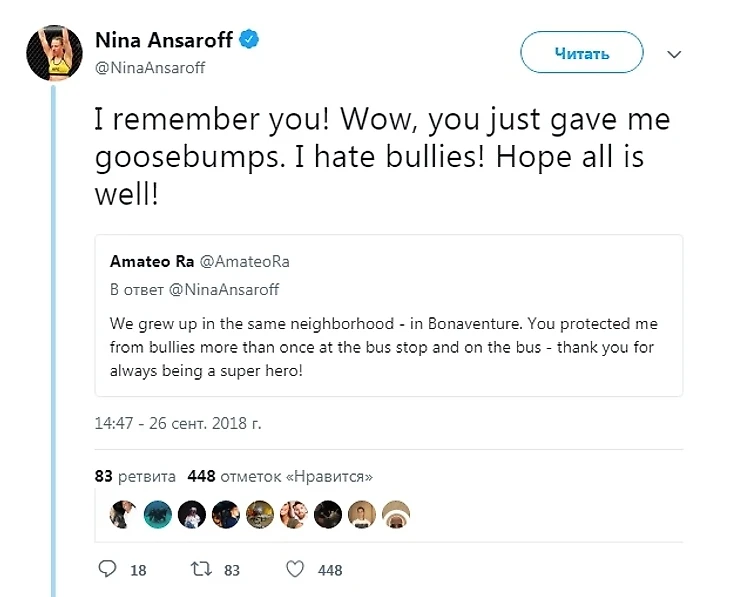 "Я помню тебя! Вау, у меня сейчас мурашки по коже. Ненавижу гопников! Надеюсь, у тебя все хорошо!"