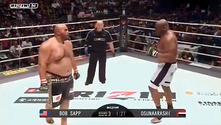 В Саитаме Боб встречался с бывшим египетским сумоистом Осунаараши, который дебютировал в смешанных единоборствах. Специально для гигантов (вес обоих бойцов превышал 150 кг) промоушен Rizin придумал особые правила – три раунда по три минуты. Сапп начал поединок в привычной манере – обрушил шквал атак на соперника с первых секунд, но Осунаараши выстоял. А к третьему раунду у обоих закончился бензин: бойцы застывали на несколько десятков секунд и без ударов просто смотрели друг на друга. Даже призывы рефери не помогали. Судьи отдали победу Бобу Саппу единогласным решением.