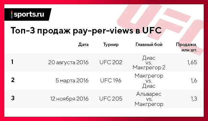 • Он оккупировал топ-3 прибыльных турниров UFC (один бой против Альвареса и два против Диаса совокупно принесли 4,5 миллиона продаж PPV).
