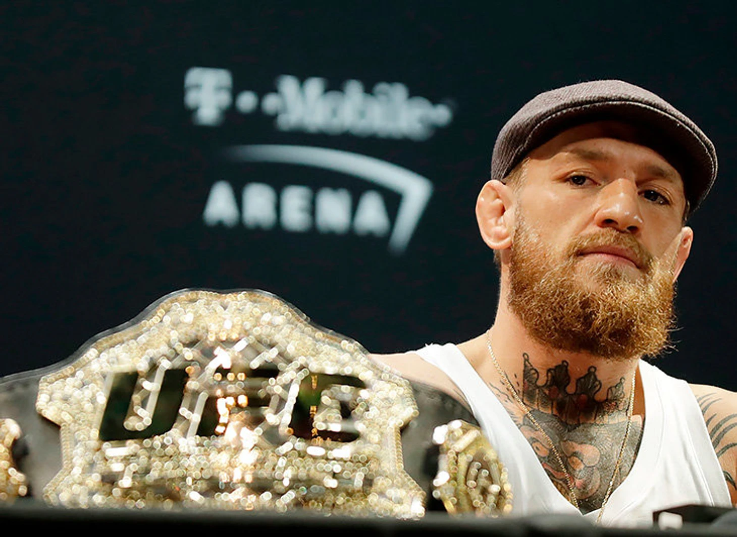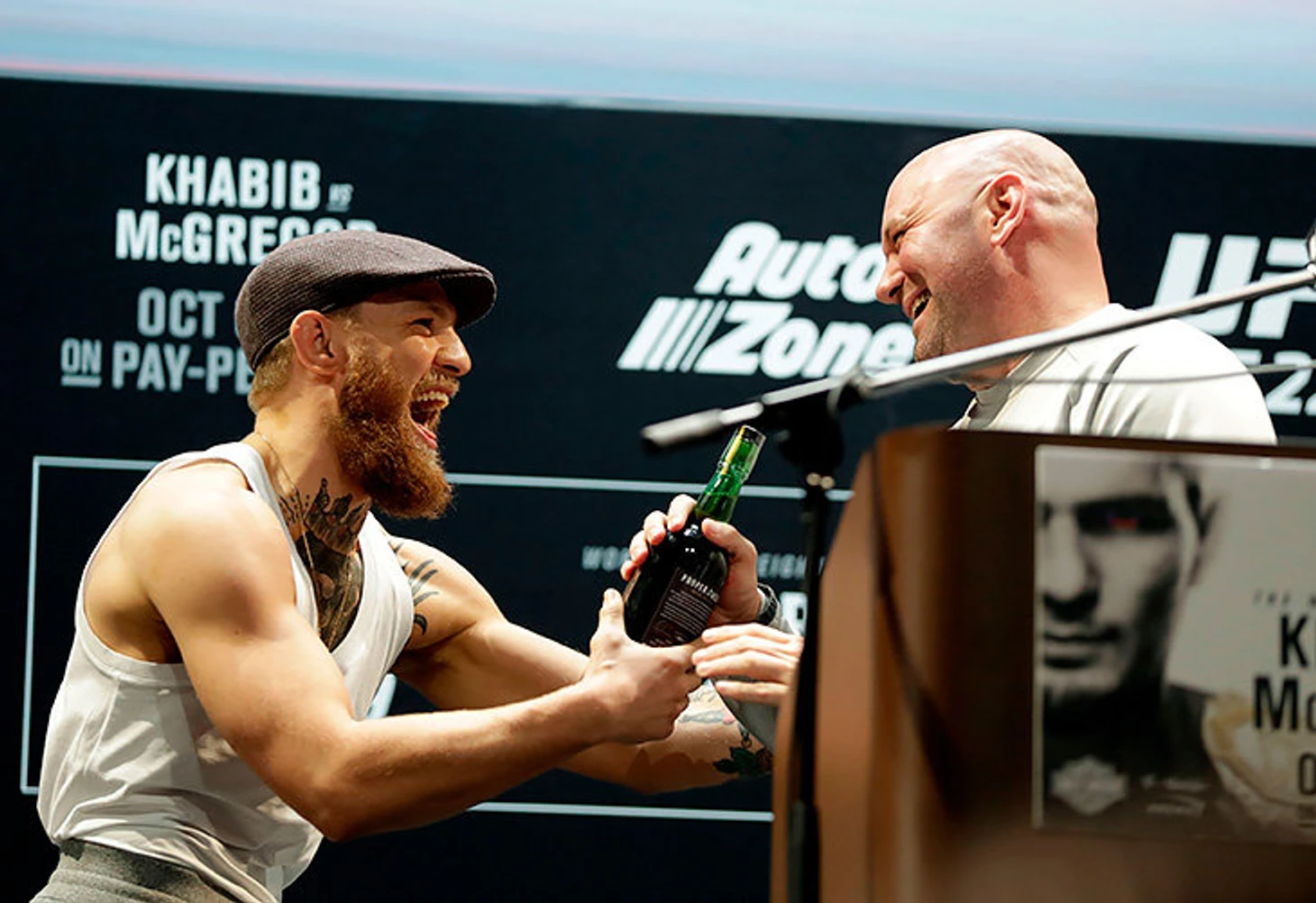 Конор опоздал на 25 минут. Он появился в зале в майке-алкашке, кепке, а на ногах у него были тапочки. В руках у него была лишь бутылка виски Proper 12 – пояса он оставил в своей спальне из-за спешки (правда, позже их все-таки принесли ирландцу).
