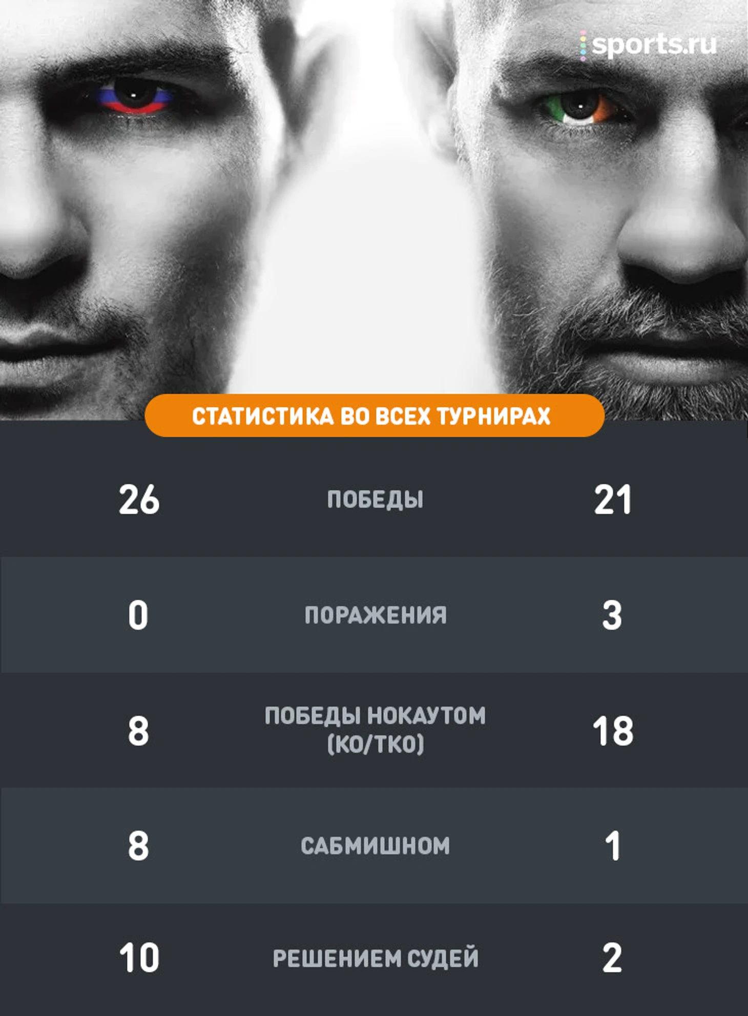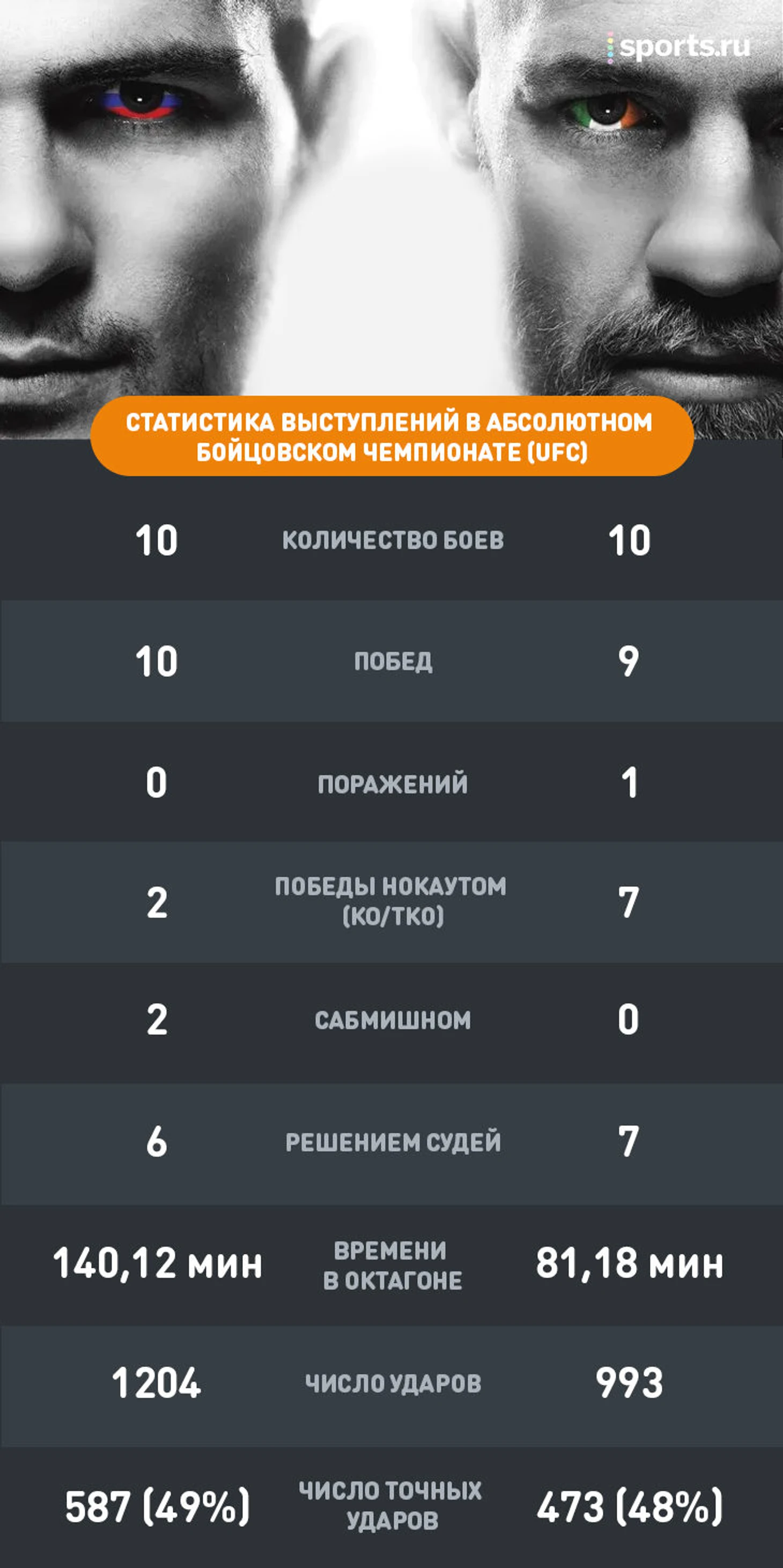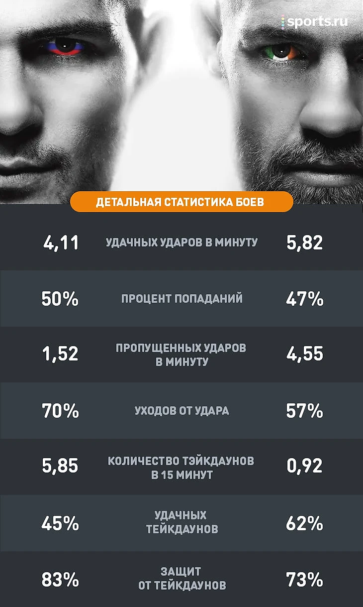 Что касается Конора, то ирландец – известный ударник. Но вот что интересно: если верить цифрам, в цель он попадает реже, чем в половине случаев. Хабиб немного точнее – 49 процентов против 48.