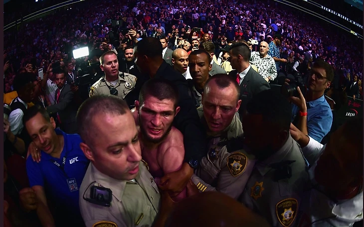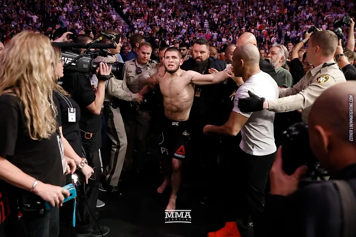 Впервые в истории UFC ринг-анонсер Брюс Бафер объявил победителя боя без присутствующего победителя. Нурмагомедова, в сопровождении охранников, выводили в подтрибунное помещение. И, соответственно, Хабиб вышел из клетки в него полетели стаканы, пиво и кто-то бросил в него флаг Ирландии.
