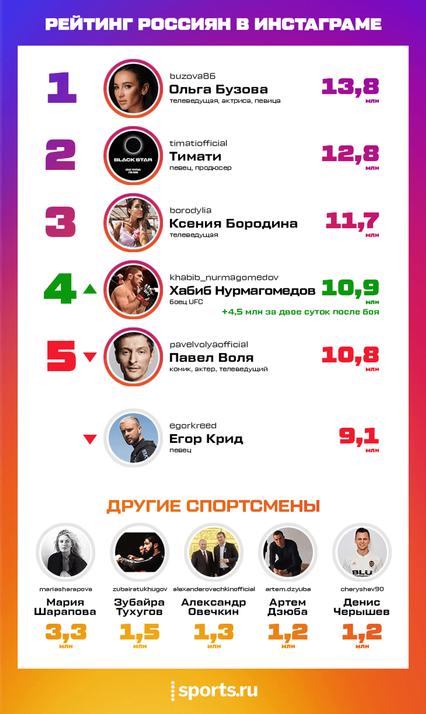 Ближайшая преследовательница Нурмагомедова среди российских звезд спорта - теннисистка Мария Шарапова (3,3 млн подписчиков). На третьем месте по популярности – другой боец UFC и верный друг Хабиба Зубайра Тухугов (стал популярен после конфликта с Артемом Лобовым плюс с ним постоянно делится аудиторией Нурмагомедов, отмечая в своих публикациях).
