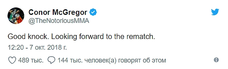 После поражения от Хабиба Нурмагомедова в рамках UFC 229 и последующих событий, по ходу которых Хабиб Нурмагомедов спровоцировал на арене в Лас-Вегасе массовую потасовку с участием членов команд двух спортсменов, ирландский боец оставил в своем Twitter запись следующего содержания: