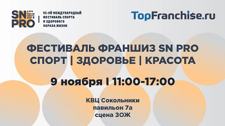 9 ноября в Москве в рамках VI-го международного фестиваля спорта и здорового образа жизни «SN PRO Expo Forum-2018» состоится ФЕСТИВАЛЬ ФРАНШИЗ в сфере спорта, здоровья и красоты при поддержке самого крупного на сегодняшний день каталога франшиз в России и СНГ - TopFranchise.ru