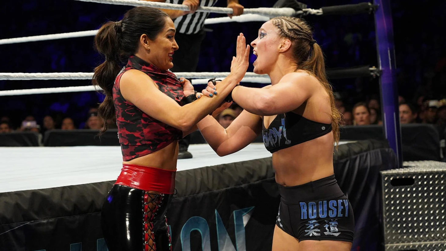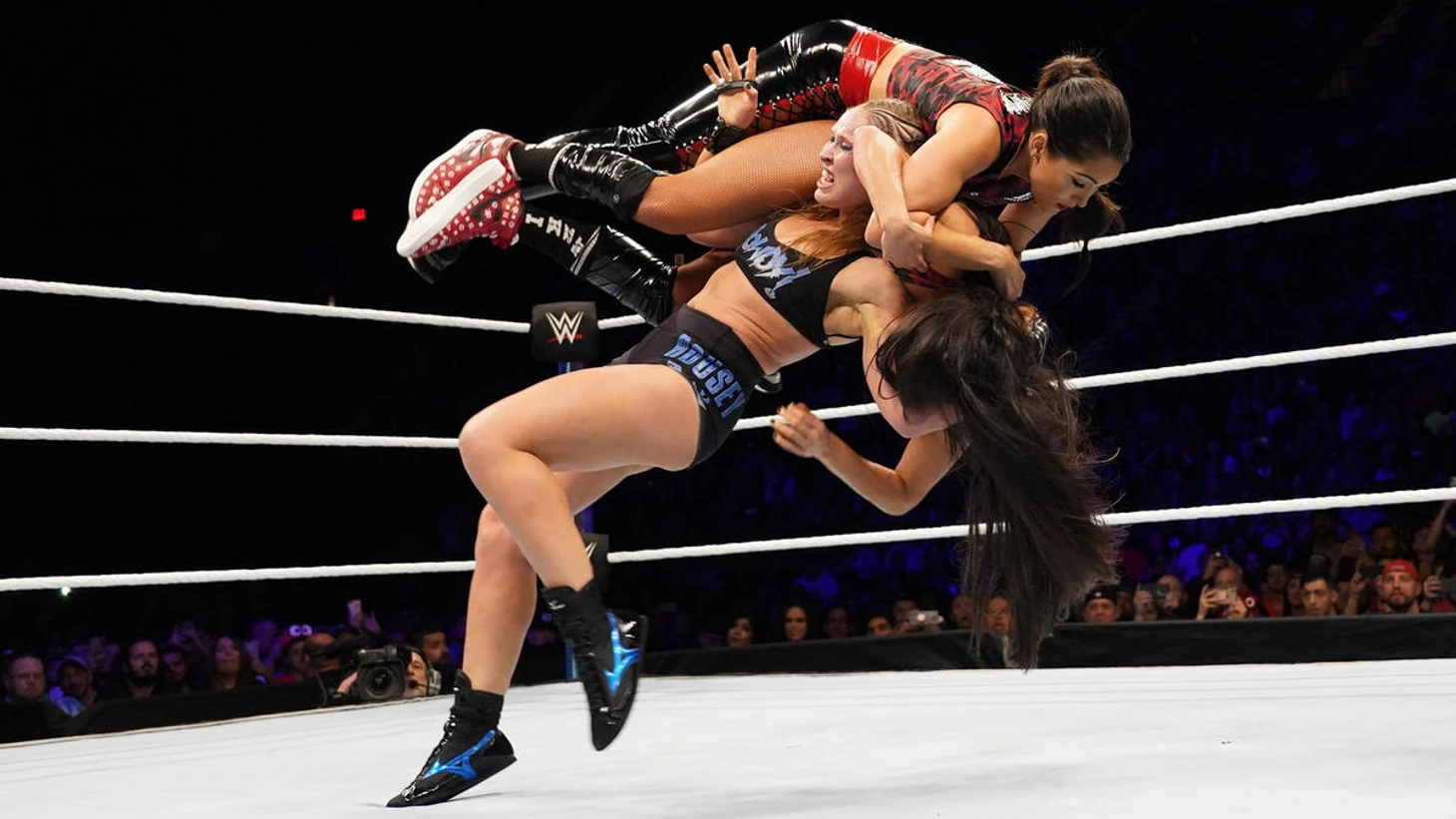 В погоне за бесконечным желанием срубить как можно больше денег на пока ещё не замыленной звезде Ронды Раузи, мы получили мейн-эвент, в котором бывшая чемпионка UFC защищала свой титул красного бренда против Никки Беллы и её весёлой сестрёнки. Первое, что можно точно отметить - участие в "Тотал Беллас" не прибавляет ринг-скилла, потому что Никки осталась абсолютно на том же нулевом уровне селлинга, рестлинга и отношения к своей работе в четырёхугольнике. Это была борьба, хреновая мимика, телодвижения и вообще всё что угодно, кроме рестлинга.