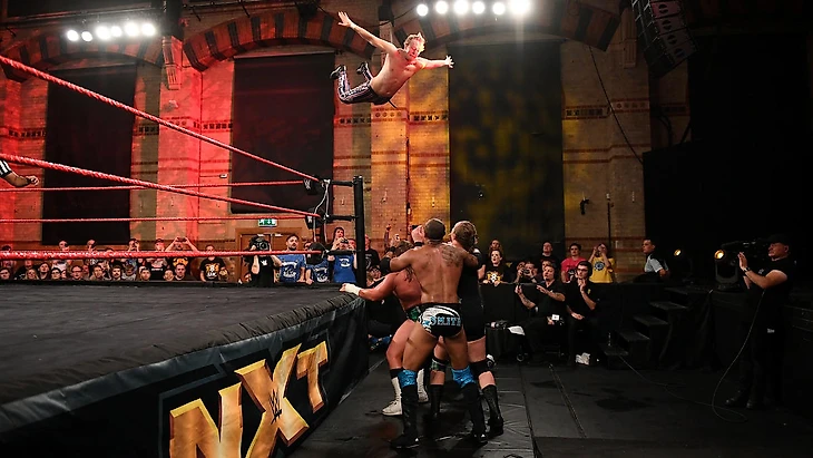 Несколько выпусков нам показывали, как Братья Коффи уничтожают своих оппонентов грязными способами, а позже к ним присоединился и Вольфганг, которого все немного подзабыли, а ведь он наделал шума в турнире UK пару лет назад. Теперь эта троица кошмарит остальной британский дивизион, и на вчерашнем выпуске им противостояли Марк Эндрюс, Флэш Морган Уэбстер и Эштон Смит, который пока что запомнился лишь мелодией, схожей со знаменитым "woop woop" Марти Скёррла.
