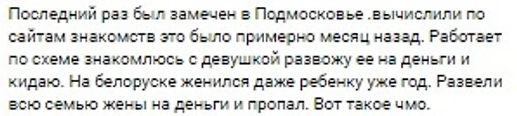 К сожалению, хорошая карьера рестлера не обозначает, что и в жизни человек окажется достойным, чем Илья Малкин с удовольствием пользуется. На скрине ниже очередная жертва, на этот раз из Республики Беларусь, пишет о том, как он киданул её семью на полмиллиона денег, для чего не поленился жениться на несчастной девушке (авторская орфография сохранена):